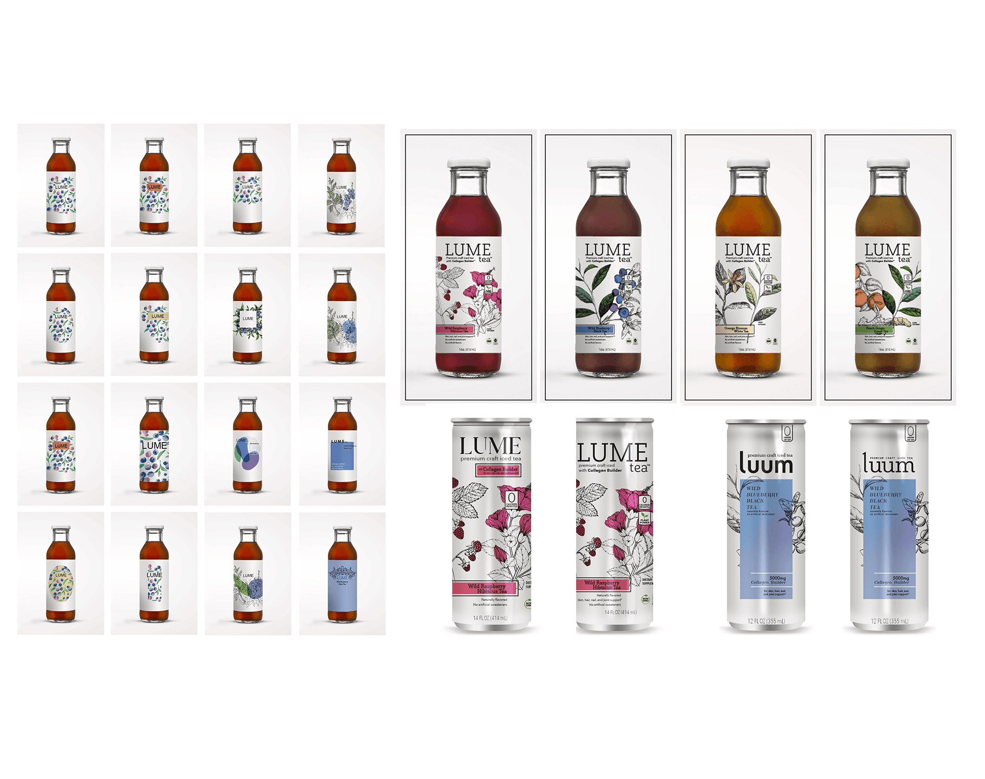 Tasked with developing a brand and packaging for an in-development sparkling collagen tea, I developed rounds of iterations as direction and even the name changed through the process. Through it all, we maintained the botanical nature of the ingredients in each flavor, as we moved more and more to an upscale and modern customer. I had to do some product research at Erewhon for this one.
