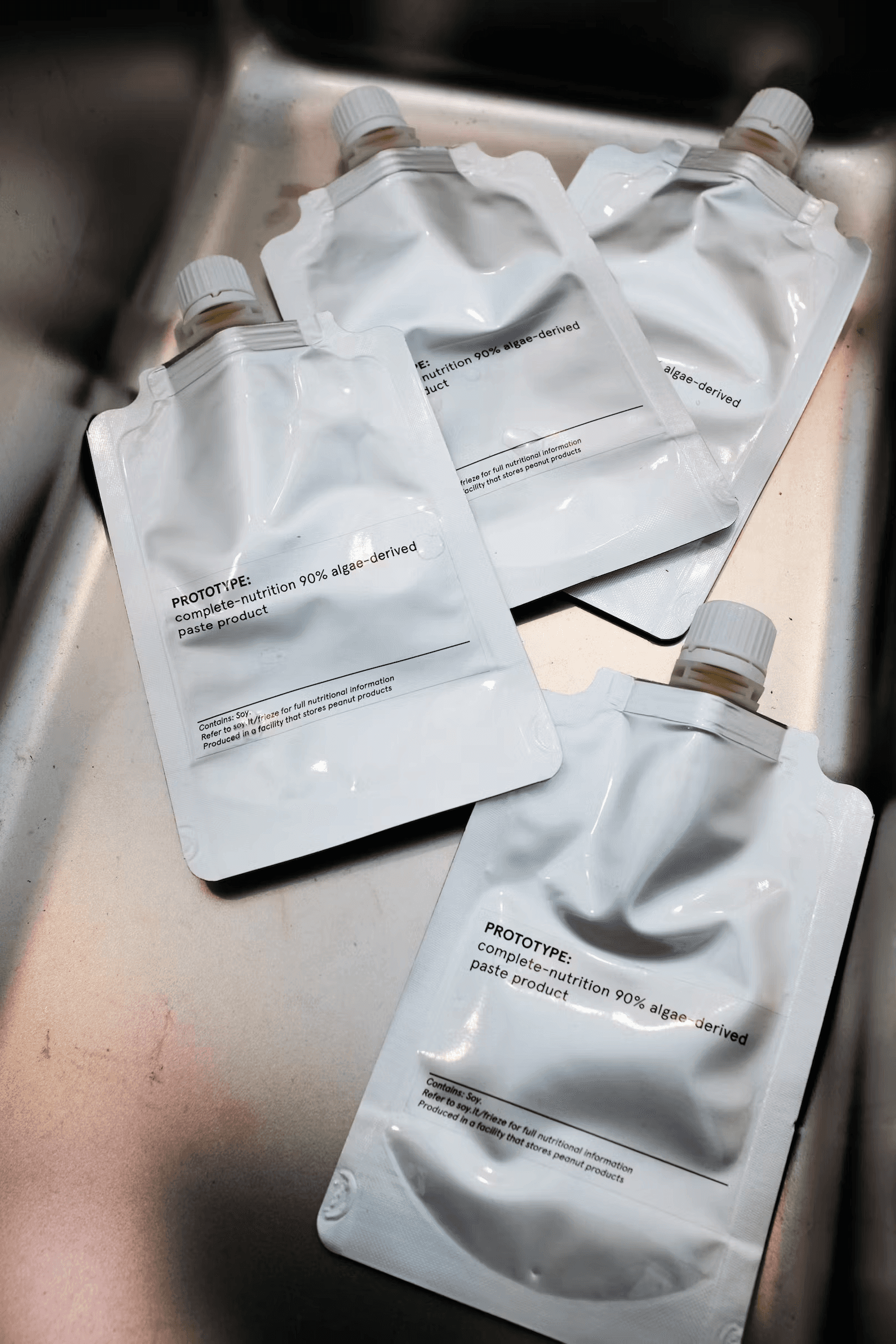 Sean developed an algae based nutrient paste that was also served up in mylar pouches I designed as well. Nhu Duong designed custom jumpsuits for the exhibit, completing the look for our futuristic-trade-show-refreshment-activation-art-exhibit.